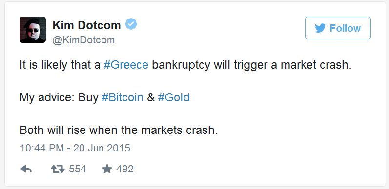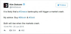 “Sembra che la bancarotta della Grecia si trascinerà un crollo dei mercati. Il mio consiglio: Comprate oro e Bitcoin.  Entrambe saliranno quando i mercati crolleranno. – 20 giugno 2015”