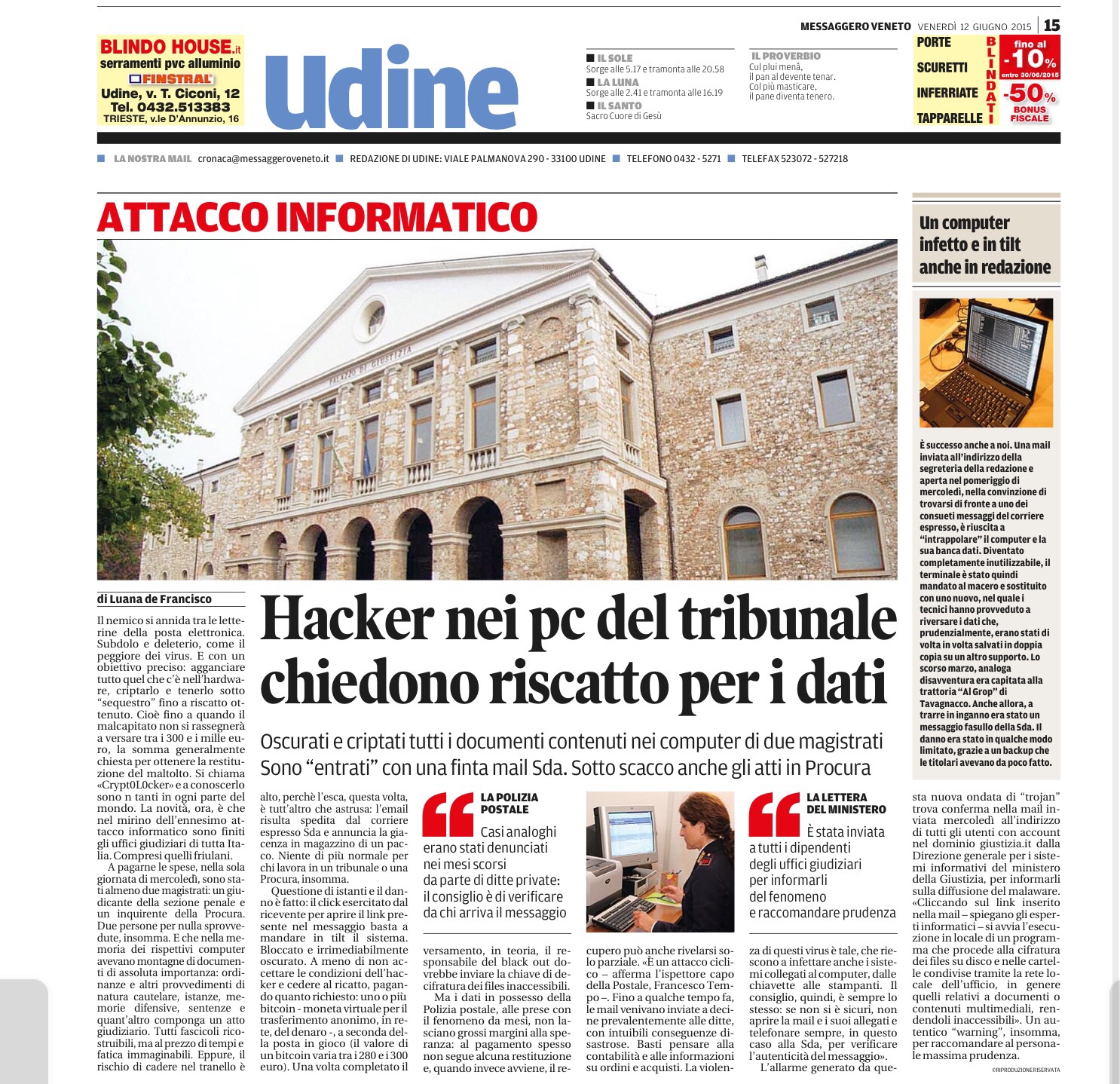 Riportiamo la notizia apparsa ieri sul quotidiano locale friulano Messaggero Veneto che si rifà al rapporto Clusit 2016 (Associazione Italiana per la Sicurezza Informatica) i quali dati offrono una panoramica abbastanza inquietante del cybercrimine in Italia. Il riferimento parla di un aumento del 30% annuo di aziende e soggetti colpiti da ransomware cryptolocker e suoi derivati e di riscatti pagati preferibilmente in bitcoin per un valore di 9 miliardi di euro solo per quanto riguarda oltre un migliaio di casi denunciati nel 2015.