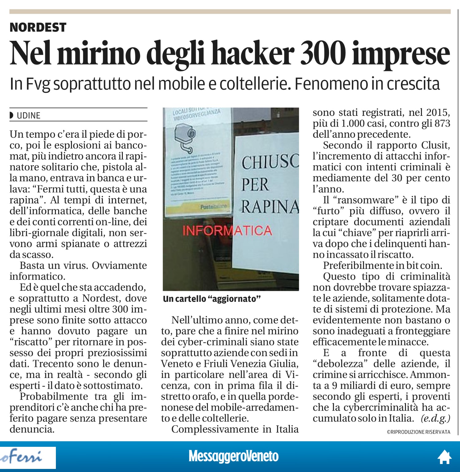 Riportiamo la notizia apparsa ieri sul quotidiano locale friulano Messaggero Veneto che si rifà al rapporto Clusit 2016 (Associazione Italiana per la Sicurezza Informatica) i quali dati offrono una panoramica abbastanza inquietante del cybercrimine in Italia. Il riferimento parla di un aumento del 30% annuo di aziende e soggetti colpiti da ransomware cryptolocker e suoi derivati e di riscatti pagati preferibilmente in bitcoin per un valore di 9 miliardi di euro solo per quanto riguarda oltre un migliaio di casi denunciati nel 2015.